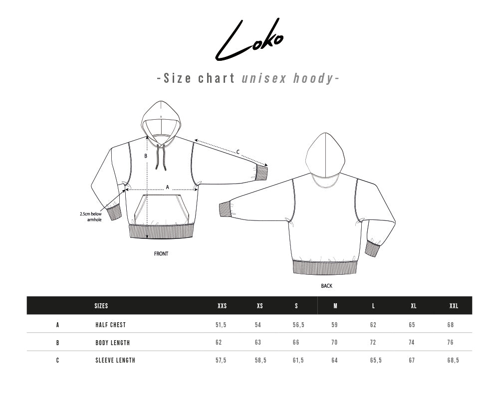Dit is een oversized unisex hoody. Als je deze graag iets strakker wil dragen neem je best een maatje kleiner. Aangezien dit een unisex model is nemen dames best een maatje kleiner dan gewoonlijk.